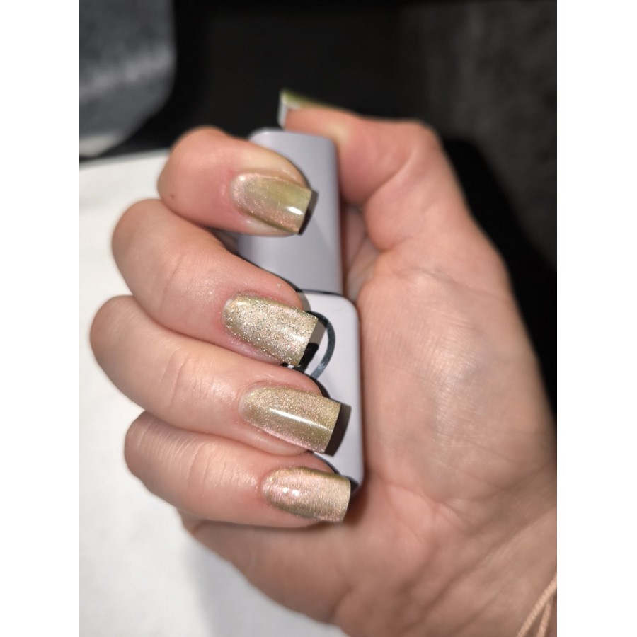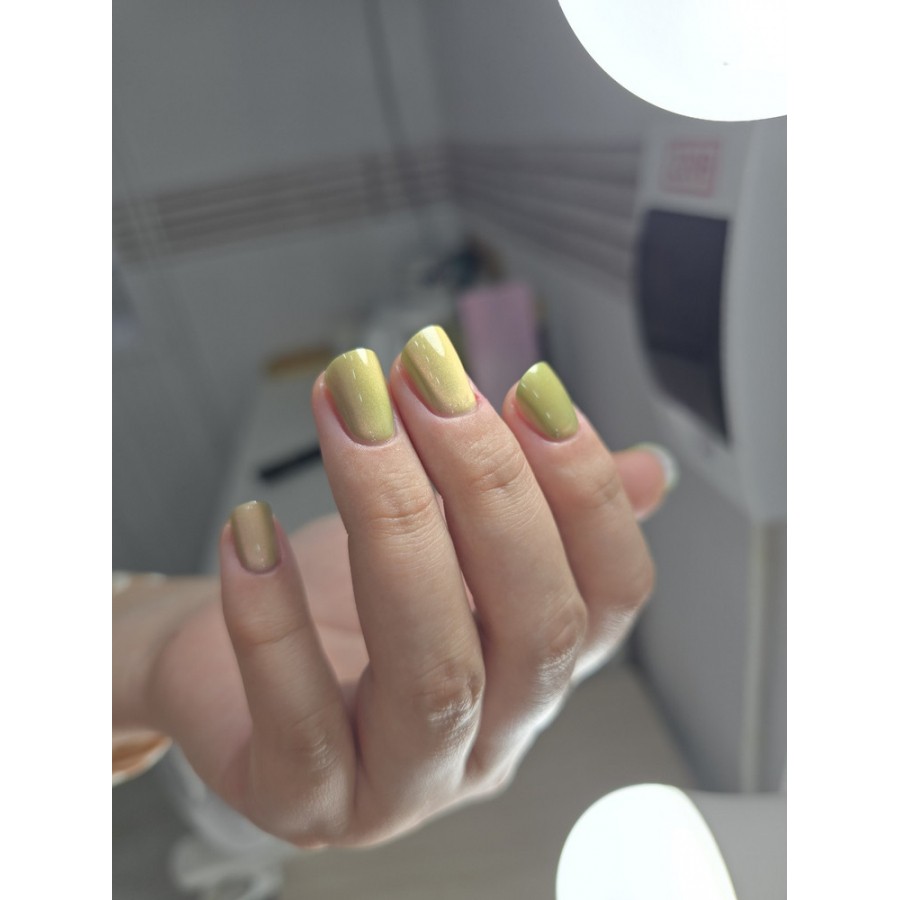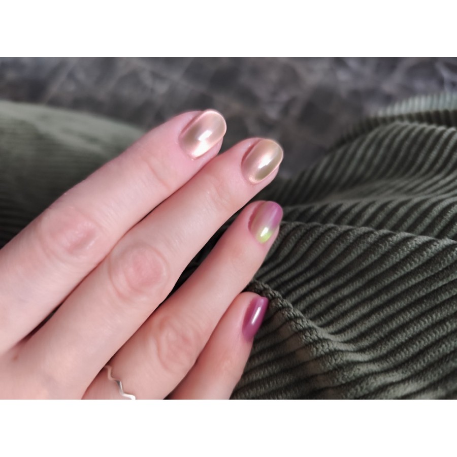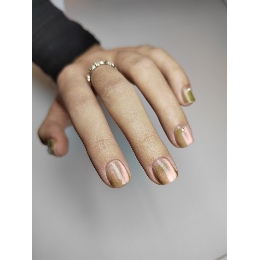 Оч красивый. Мелкий пигмент,хорошо магнитится,нежно сияет.На фото с базой и готовый маник,делаю сама. Я довольна,уже переделывать пора,а он ещё сияет). Золотисто-розовый понятно итак что красиво,но и зелёный оттенок меня более чем порадовал. Использовала с другим лаком с более ярким зелёным оттенком и комплект удался.