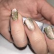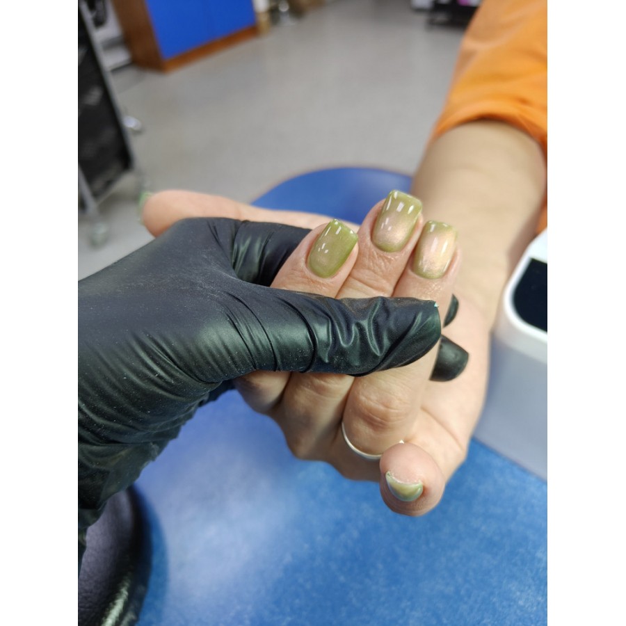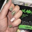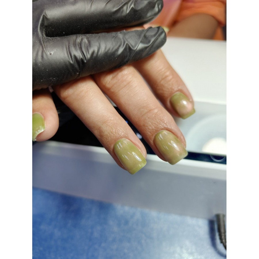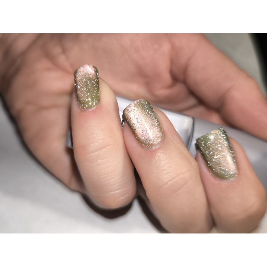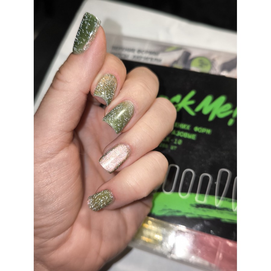 Оч красивый. Мелкий пигмент,хорошо магнитится,нежно сияет.На фото с базой и готовый маник,делаю сама. Я довольна,уже переделывать пора,а он ещё сияет). Золотисто-розовый понятно итак что красиво,но и зелёный оттенок меня более чем порадовал. Использовала с другим лаком с более ярким зелёным оттенком и комплект удался.