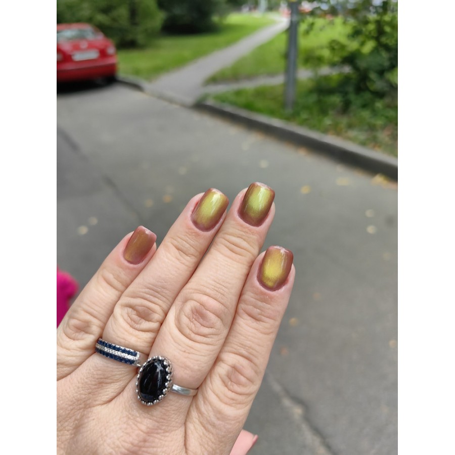 Плохой лак. На магнит тяжело реагирует. Цвет очень светлый,не соответствует картинке. На самом деле еле-еле видно на темной подложке