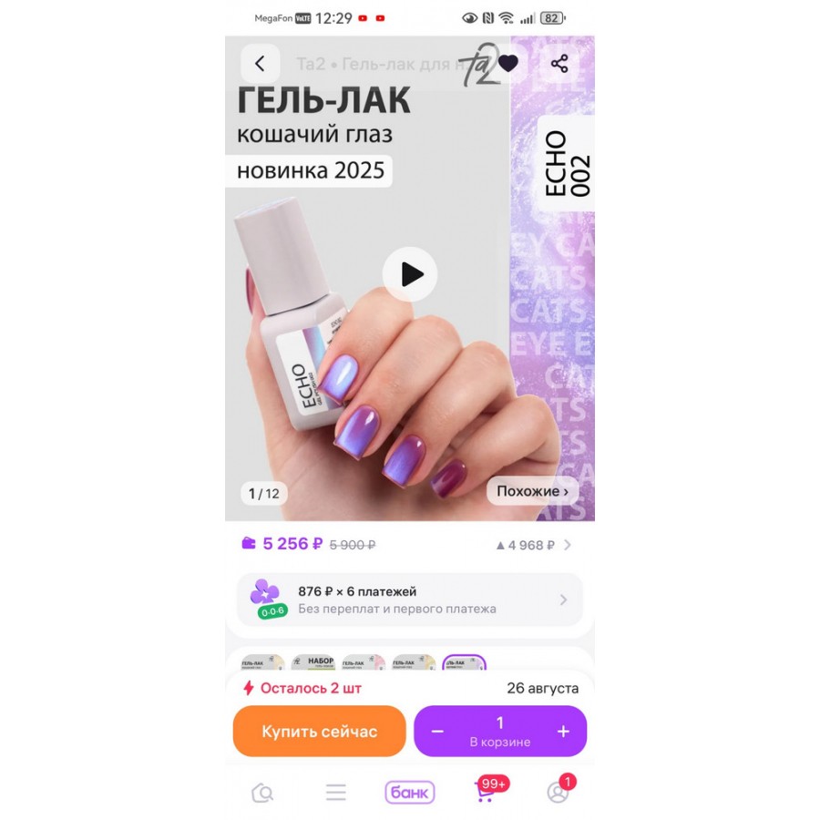 Привет, Ксения! Большое спасибо за ваш отзыв — нам очень приятно, что вы остались довольны нашим продуктом! Мы рады, что лак оправдал ваши ожидания и помог создать красивый маникюр. Если вы любите эффект "кошачий глаз", обязательно попробуйте новую коллекцию гель-лаков ECHO с двойным бликом! Это не просто покрытие — это произведение искусства на ваших ногтях, которое подчеркнёт вашу индивидуальность и стиль. С нетерпением ждём ваших новых творческих работ! С любовью, Команда TA2